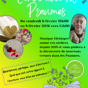 Atelier Ecrire avec les Psaumes – Monique Elchinger Les Psaumes constituent une ressource inépuisable de prière, de louange ... 06 - 08 Fév 18 h 00 min - 15 h 00 min