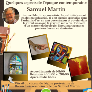 Foi et expressions artistiques, quelques aspects de l’époque contemporaine – Samuel Martin Samuel Martin est le fils d’un pasteur luthérien alsacien, très ... 11 - 15 Fév 16 h 00 min - 16 h 00 min