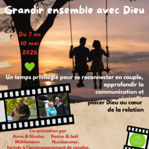 Week-end spécial couples, Viser l’essentiel, Grandir ensemble avec Dieu – Anne & Nicolas Mühlemann et Denise & Joël Nussbaumer Offrez-vous un week-end de détente et d’enseignements pour vous retrouver ... 07 - 10 Mai 16 h 00 min - 16 h 00 min