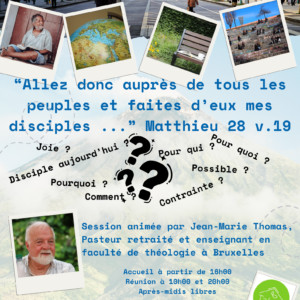 Allez donc auprès de tous les peuples et faites d’eux mes disciples … – Jean-Marie Thomas Disciple aujourd'hui, qu'est-ce à dire ? Pourquoi ? Pour quoi ? ... 13 - 17 Mai 16 h 00 min - 16 h 00 min