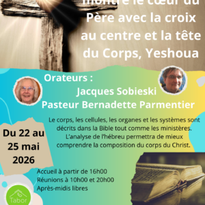 Le corps du Christ montre le cœur du Père avec la croix au centre et la tête du Corps, Yeshoua – Jacques Sobieski et Pasteur Bernadette Parmentier Nous parlerons du Corps du Messie. Bernadette Parmentier donnera des informations ... 22 - 25 Mai 16 h 00 min - 16 h 00 min