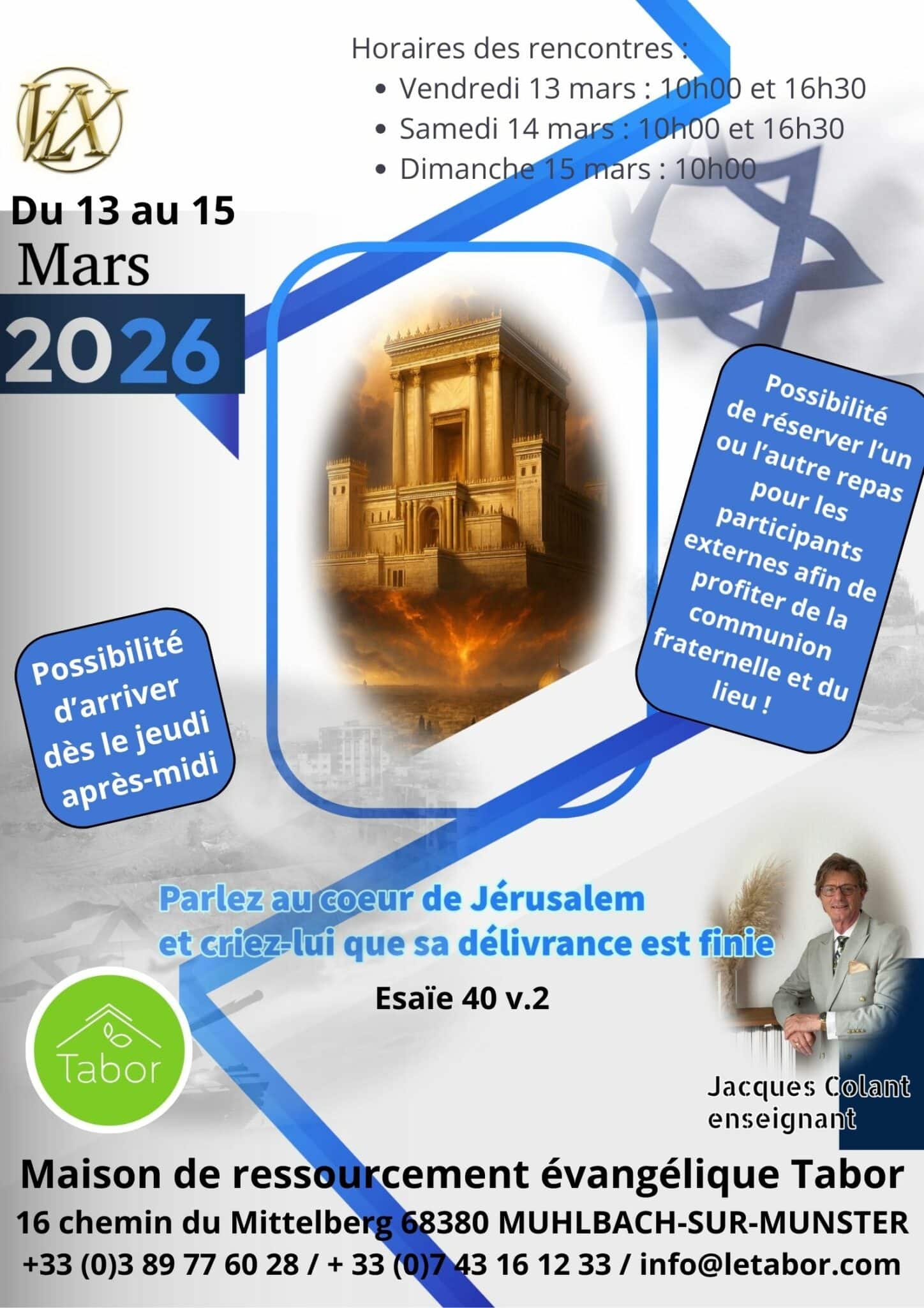 Jacques Colant est né en décembre1952. L’amour de la musique l’a conduit à étudier au prestigieux Conservatoire Royal de Musique. Son parcours professionnel a démarré par une vingtaine d’années en tant que ténor au sein de l’ensemble vocal de la radio et télévision nationale belge. Depuis quinze ans, il consacre sa vie à l’enseignement de la Torah, spécifiquement par l’étude des textes hébreux originaux, dans le but d’éclairer la place de Yéshua (Jésus) au sein de ceux-ci. Cela l’a conduit à créer une fondation ainsi qu’une école en ligne spécialisée, offrant à des étudiants du monde entier la possibilité de plonger profondément dans ce riche enseignement.